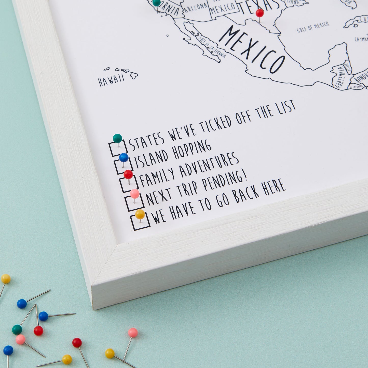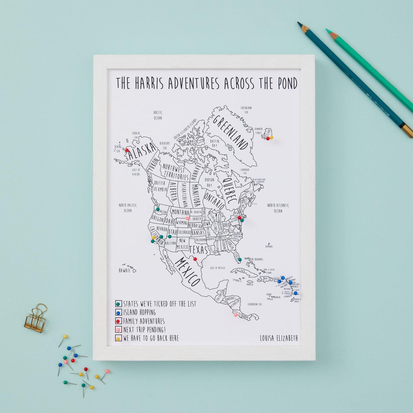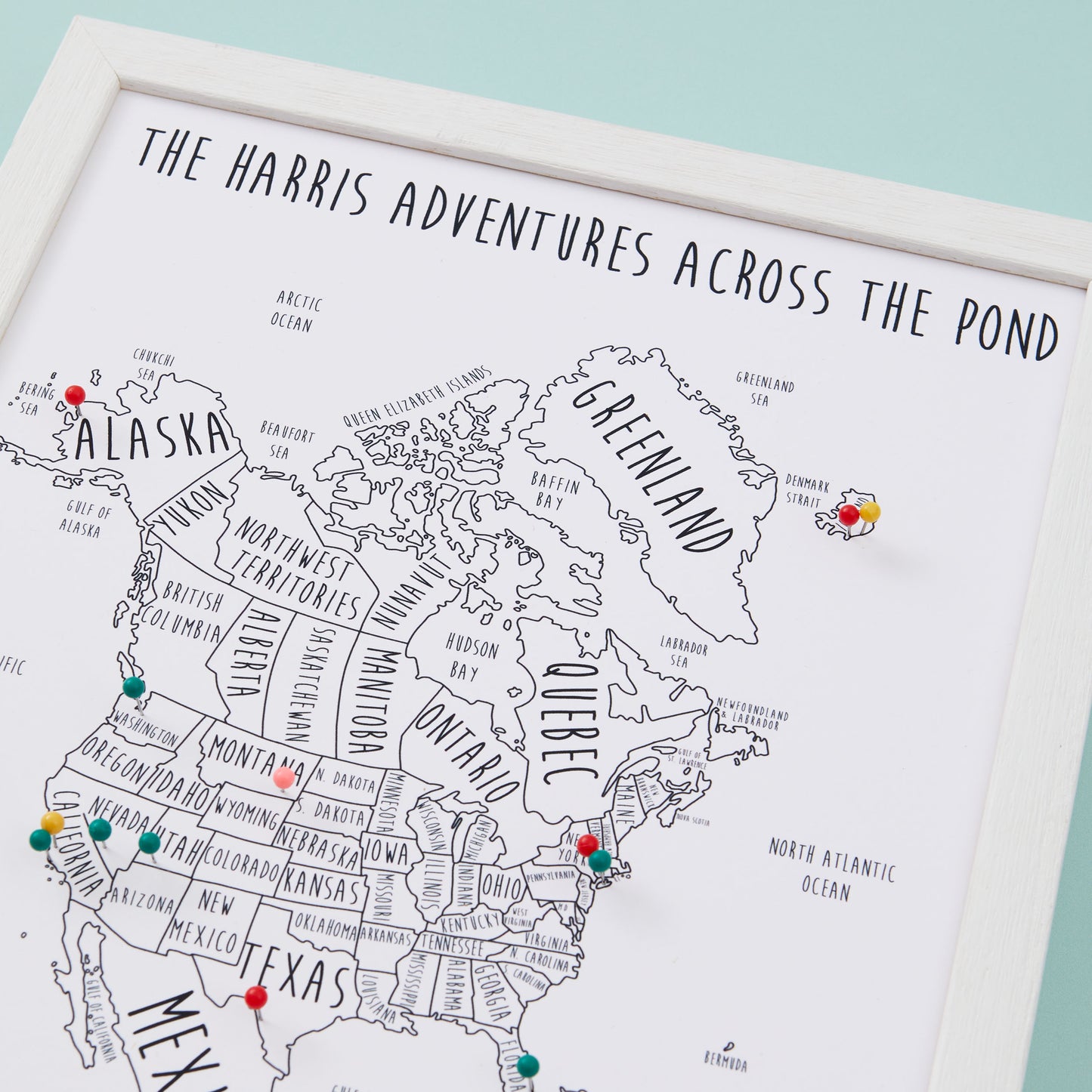Beautifully hand-drawn 'North America' pin board map, which you can personalise with colourful push pins to remember your own special adventures.