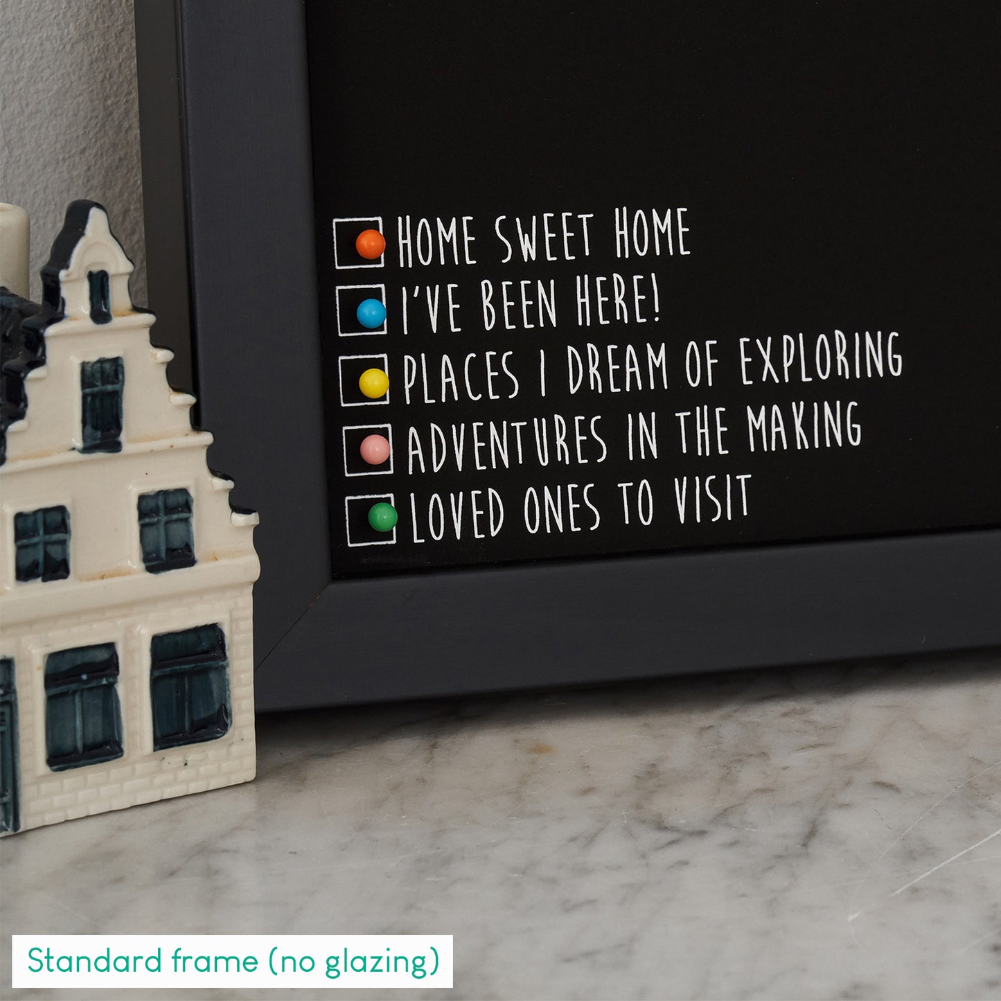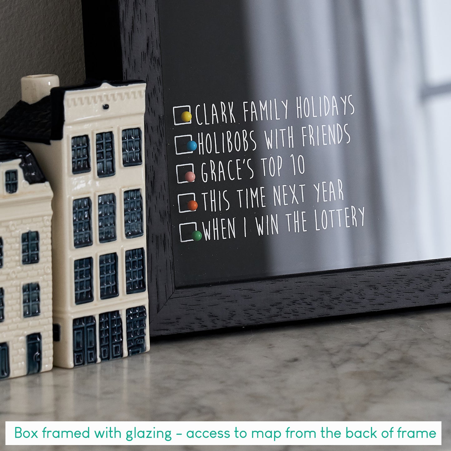 - Your chosen size and colour of the unframed pin board map, mounted onto 5mm foam board